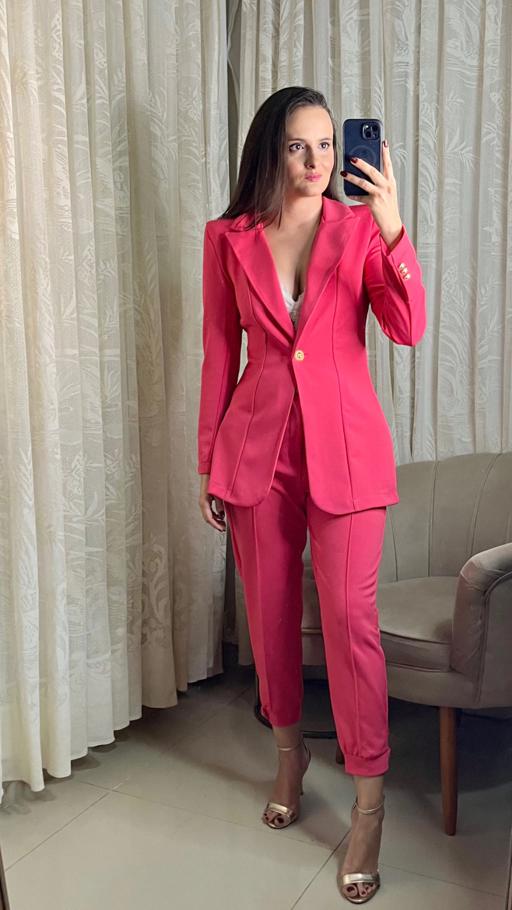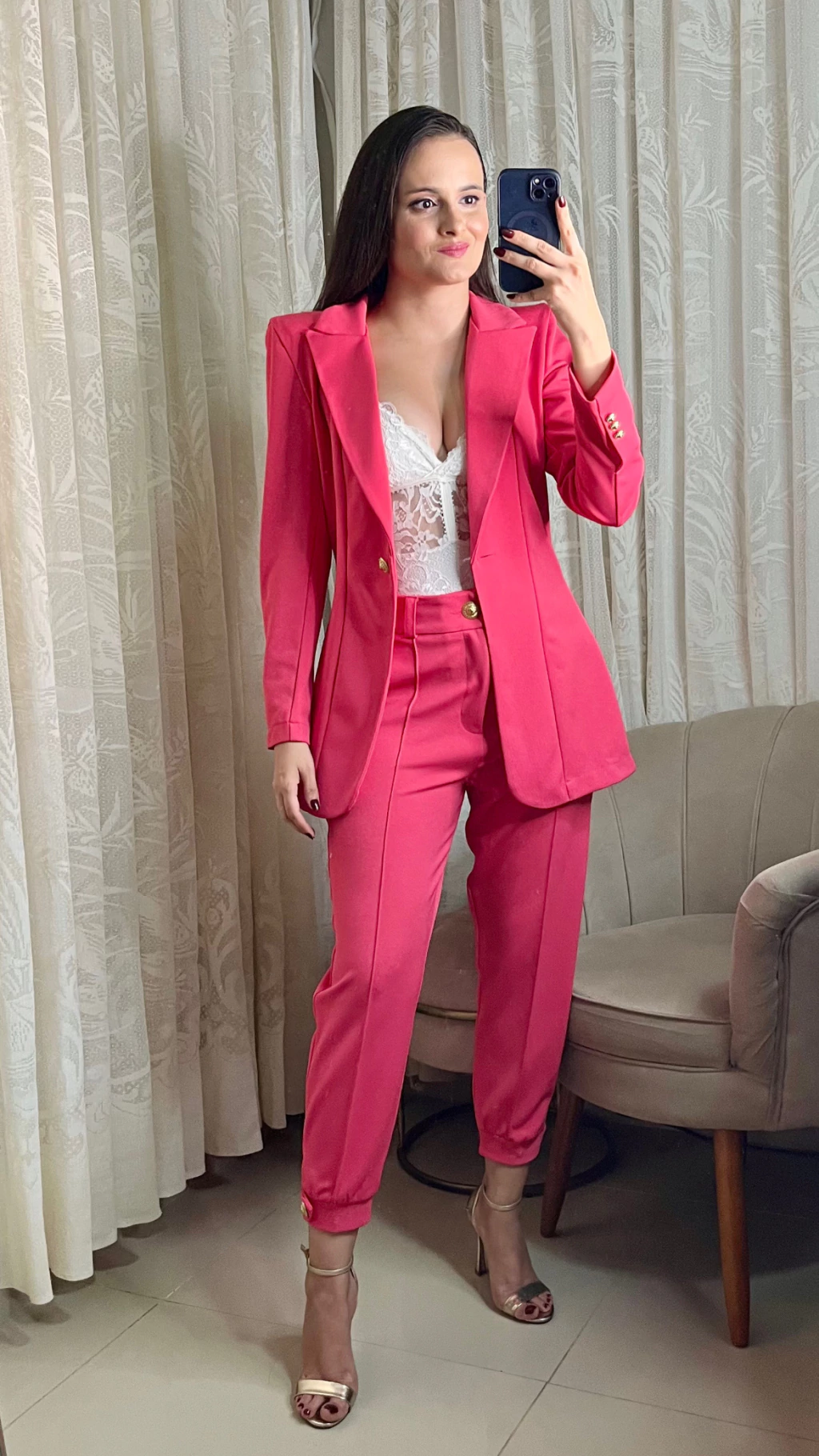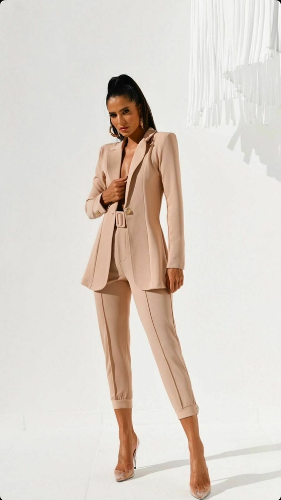 O Conjunto Angelina da SPLASH é sinônimo de sofisticação, modernidade e versatilidade. Com um corte impecável, o blazer se destaca pelas ombreiras e pela abotoadura dourada de leão, assinatura da marca. A calça ajustada na barra também possui abotoaduras e vem com um cinto destacável, feito do mesmo material das peças. O conjunto pode ser usado de diversas formas, seja junto ou separado, sempre garantindo um visual elegante.