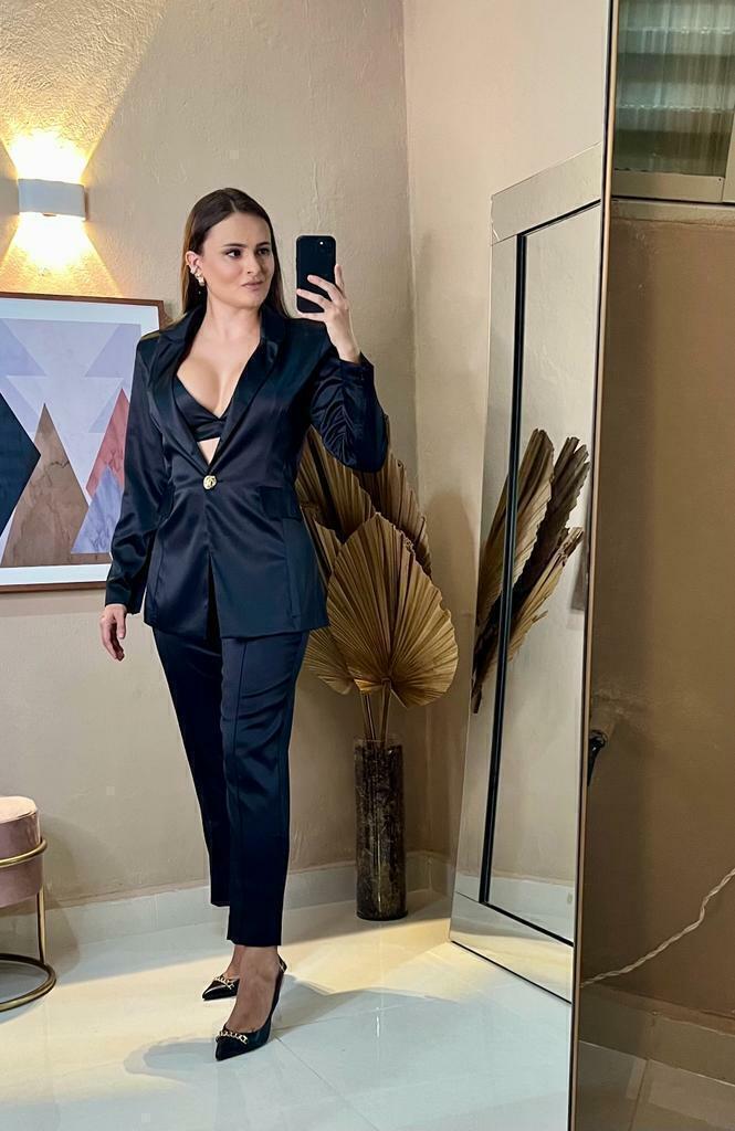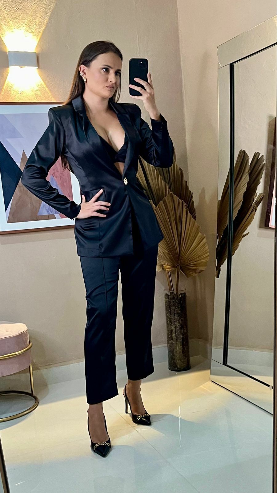 Delicado e despojado, o conjunto Ariela é um queridinho das nossas clientes. Composto por um blazer com recorte acinturado, calça cintura alta com cinto forrado e um top frente única. Confeccionado em prada, possui um brilho acetinado que atribui delicadeza ao conjunto.