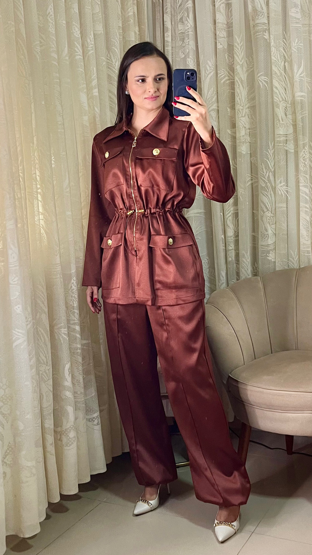 Elegante e moderno, o conjunto Karyn combina sofisticação com conforto. Composto por uma jaqueta parka de modelagem estruturada com amarração na cintura e calça de caimento fluido. Calça de modelagem reta e ampla com caimento leve, com elástico na barra.