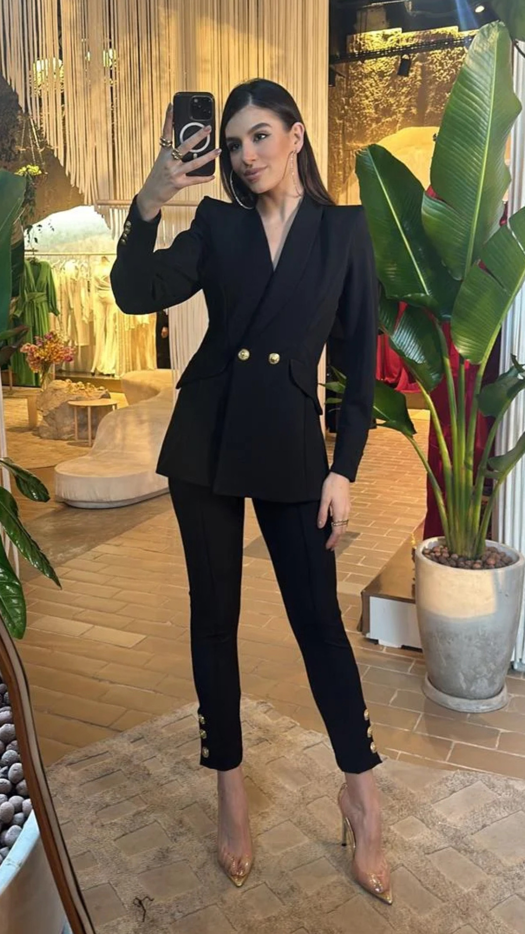 O Conjunto em Twill Kourtney é a definição de elegância e estilo. Composto pelo Blazer e Calça Skinny Kourtney, este conjunto apresenta um design sofisticado e atemporal, perfeito para diversas ocasiões. As ombreiras e a gola smoking do blazer adicionam um toque de sofisticação, enquanto a calça skinny proporciona um caimento impecável.