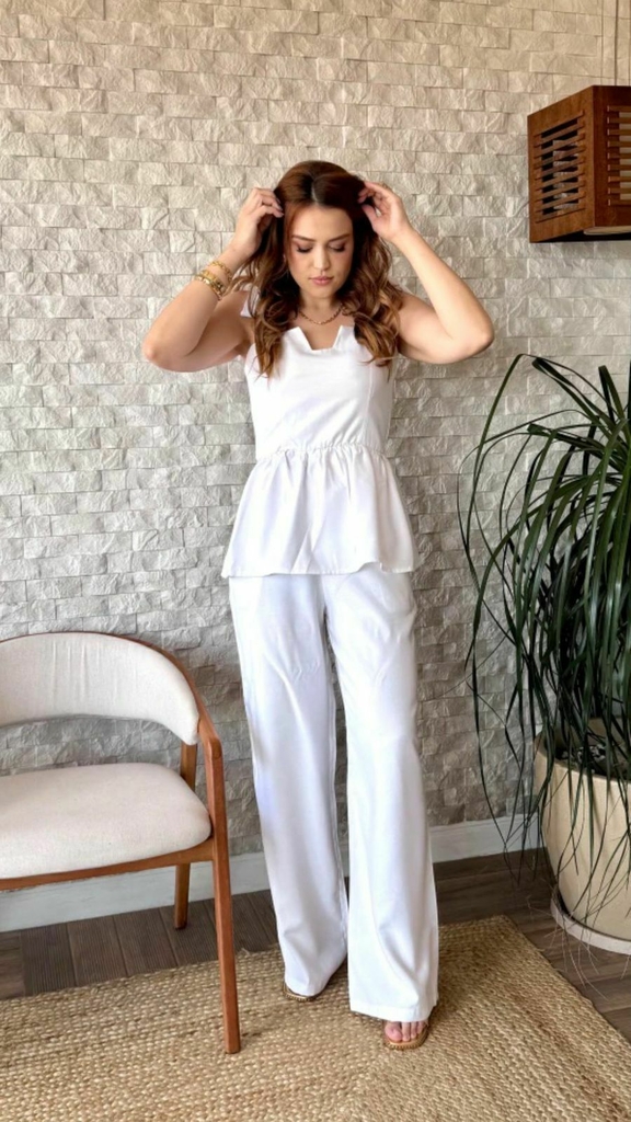 Conjunto composto de blusa com amarrações e balone na parte inferior e cak=lça tipo alfaiataria com botão.