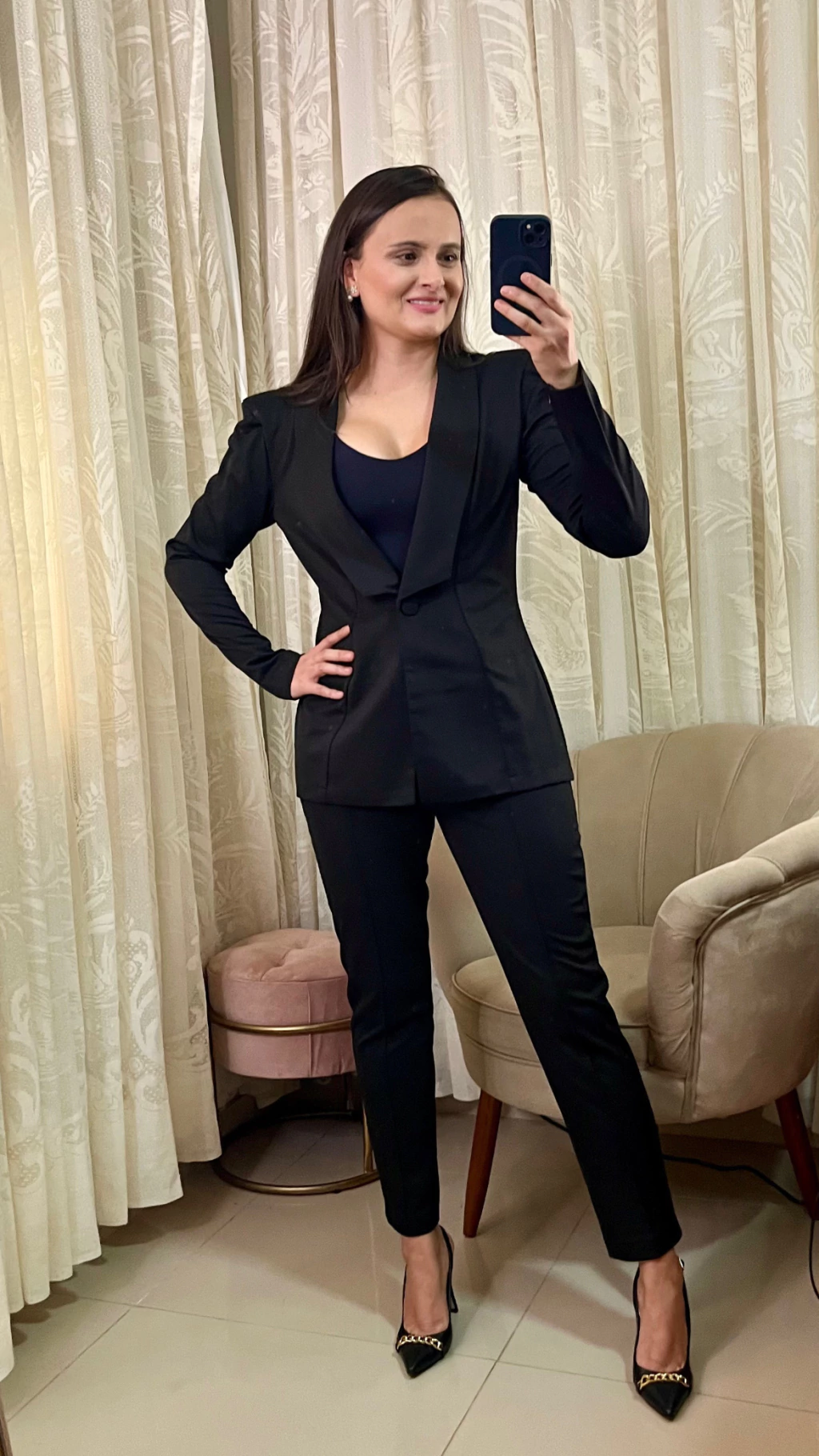 O Conjunto Pietra é elegante e atemporal, um verdadeiro clássico que merece um lugar de destaque no guarda-roupa de toda mulher. O blazer possui ombreiras altas e marcadas, enquanto o decote acentuado com gola smoking confere um ar de sensualidade discreta. Tem detalhe especial que é o zíper nas mangas possibilitando ser usado como capa.