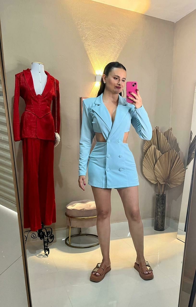 Possui ombreiras bem marcadas,l abertura em zíper nas mangas, fechamento frontal de botões e recortes laterais que afinam a cintura. Seu modelo é elegante e valoriza o corpo. seu tecido é estruturado e possui elastano.
