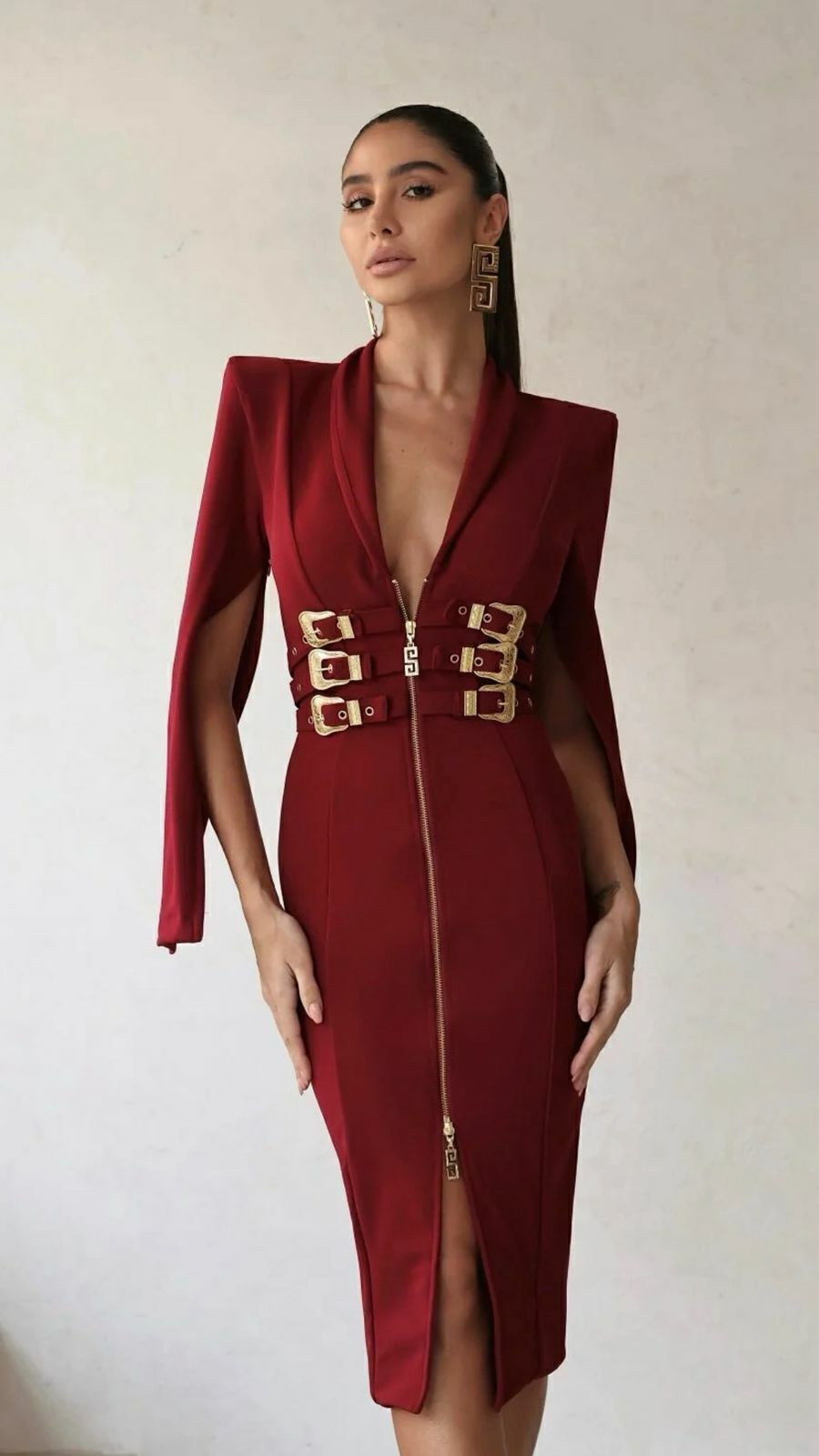 Vestido Midi Elliot é a definição de poder e sofisticação. Com um corte impecável e silhueta estruturada, ele destaca a feminilidade com elegância. O decote profundo em V aliado ao fechamento frontal por zíper cria um visual imponente, enquanto os detalhes de fivelas douradas na cintura adicionam um toque de luxo e modernidade. Perfeito para ocasiões especiais que pedem uma presença marcante.