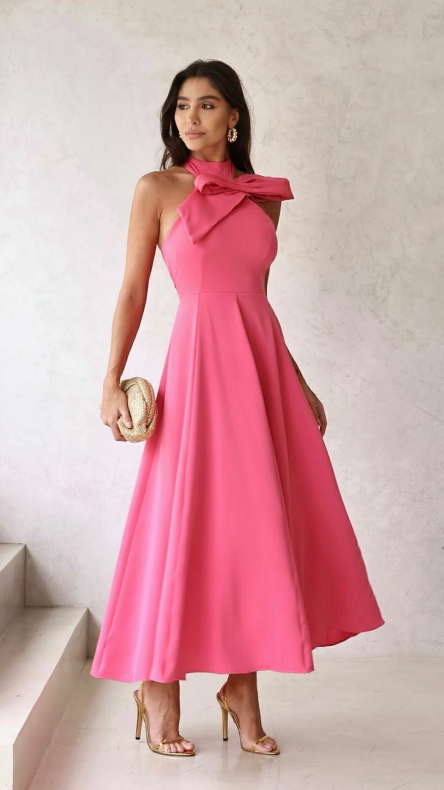 Este vestido é a escolha ideal para mulheres que desejam exibir um estilo elegante e ao mesmo tempo confortável. Com um design fluido e detalhe elegante em laço, ele se adapta perfeitamente ao corpo, proporcionando liberdade de movimento. Perfeito para diversas ocasiões, desde um casamento no civil ao ar livre ou até um passeio.